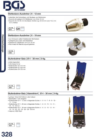 • Stufenbohrer Ø 4 - 20 mm in folgenden Stufen: 4 - 6 - 8 - 10 - 12 - 14 -